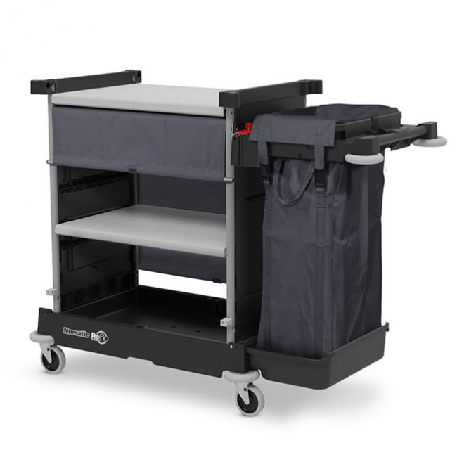 Ce chariot hôtelier est équipé d'une large étagère double et d'un support sac à linge 100L gris.