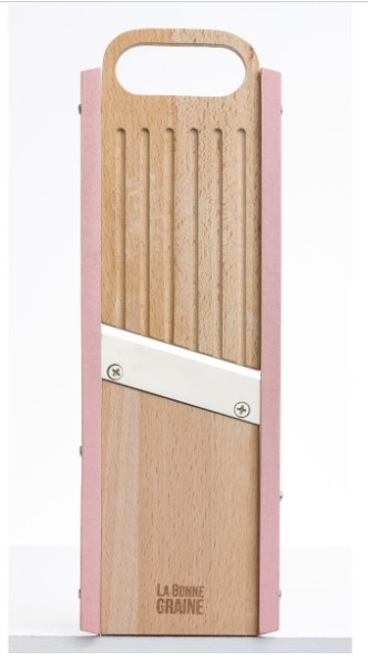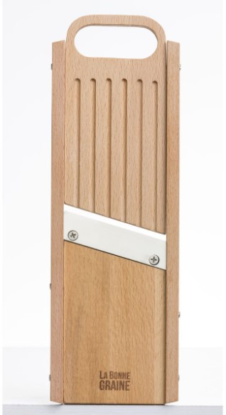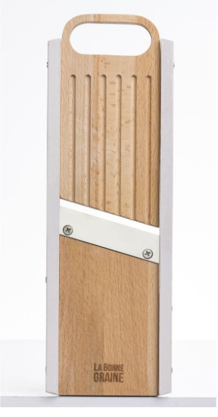 Mandoline professionnelle de cuisine en bois prévue pour découper les légumes en tranches et rondelles avec grande précision.