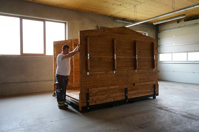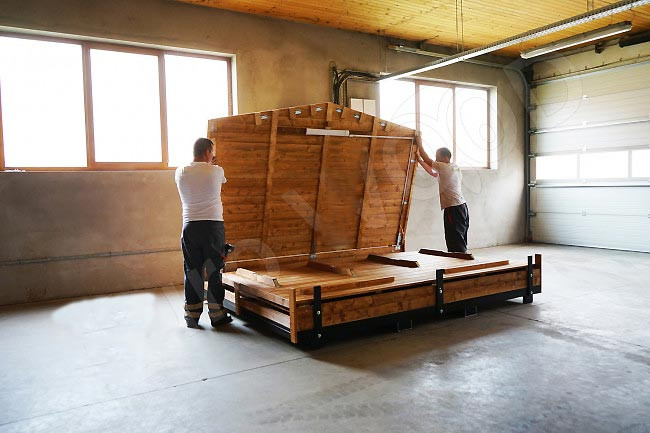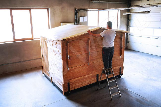 En 2015, nous avons démarré la production des chalets de Noël pliables en utilisant notre expérience professionnelle acquise avec la construction des maisons en bois, et nous avons ainsi réussi à concevoir et à fabriquer une construction si bonne que la production des chalets de Noël pliables constitue l’activité principale de notre entreprise.