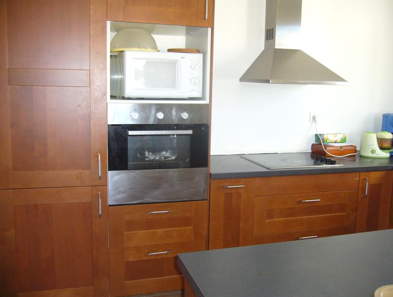 - Découpe et mise en place du plan de travail, avec encastrement d’une plaque de cuisson et d’un évier.