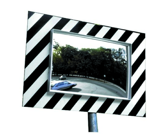 Ce miroir de sécurité rectangulaire avec cadre rayé noir et blanc est conçu pour améliorer la visibilité et de limiter les risques d’accidents.