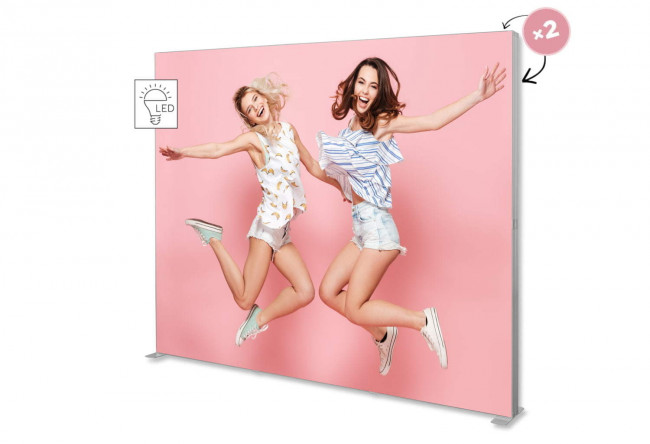 Des cadres sur pieds avec tissu tendu rétro-éclairé en grand format (éclairage leds). Le textile tendu imprimé est non-feu, tendu via un jonc silicone, imprimé en haute résolution et interchangeable à volonté, votre cadre tissu tendu rétro-éclairé sera habillé recto seul avec tissu noir occultant au dos ou recto-verso pour un impact et une surface de communication maximum. Choisissez un format L100xH250cm pour de petits événements, un usage en PLV mais aussi des grands formats jusqu'à une largeur de 5 mètres ! et créez des murs d'image rétro-éclairés à fort impact mais aussi des stands modulaires, des stands transportables rétro-éclairés pour vos foires, salons, show-room et expositions. Formats diponibles recto/verso L200xH250cm, L285xH250cm, L300xH250cm, L400xH250cm et L500xH250cm.