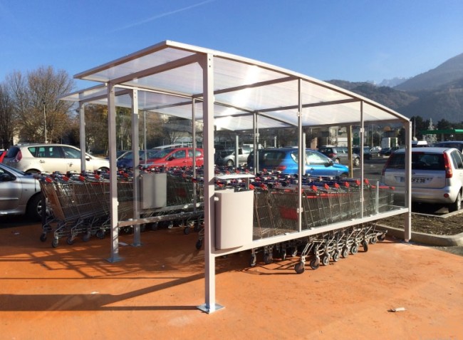 Cet abri chariot courbe en acier galvanisé constitue un espace de rangement et distribution caddie pour parking supermarché conçu pour améliorer le service des chaînes de grande distribution, hypermarché et grands magasins de collectivités.