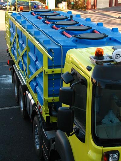 -Le boîtier de télécommande situé dans la cabine du camion déclenche un jeu de buses de différents calibres, monté sur une rampe fixe à l’arrière du véhicule et dirigé selon les besoins sur les différentes voies de circulation : La bande d’arrêt d’urgence, la voie du véhicule, la voie centrale, la voie rapide