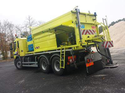 - La saleuse épand de la « bouillie de sel », mélange de sel et de saumure
