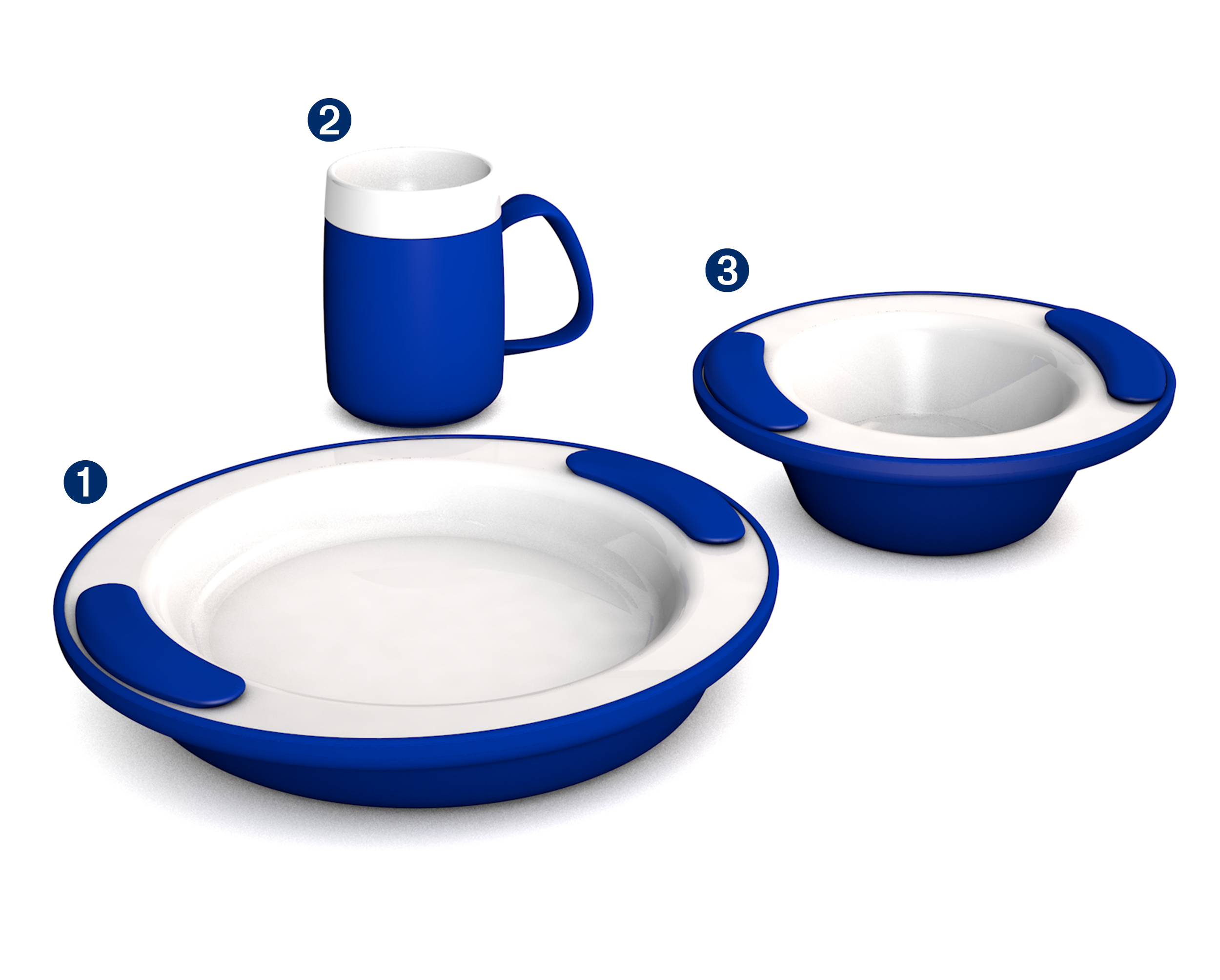 - L'assiette : poignées de couleurs antidérapantes pour une bonne tenue en main facilitant ainsi la prise des repas.