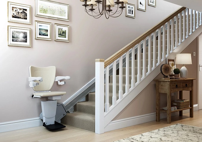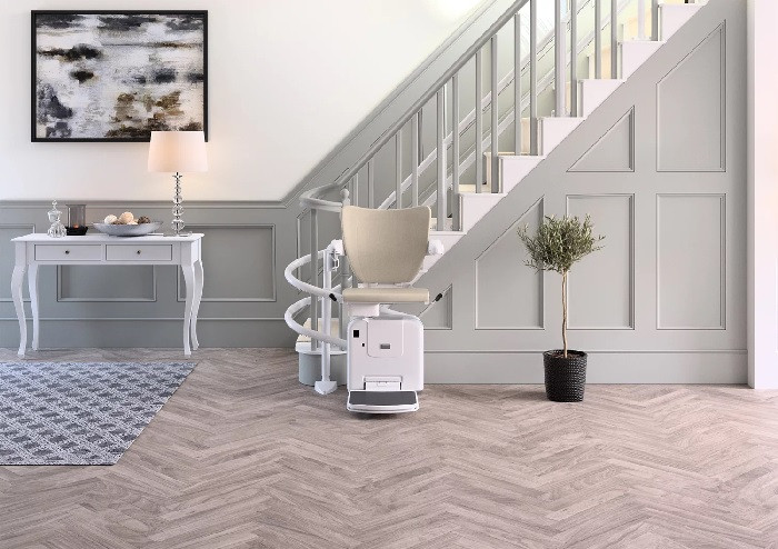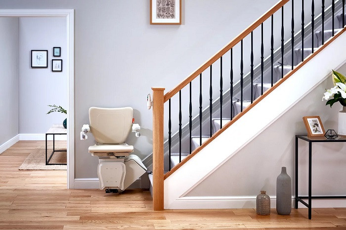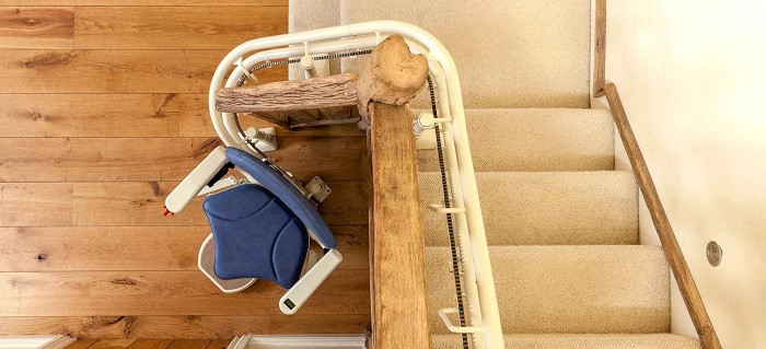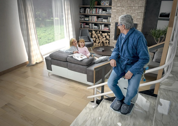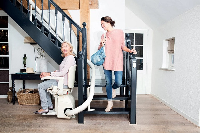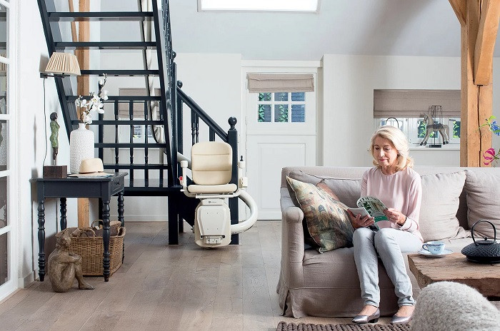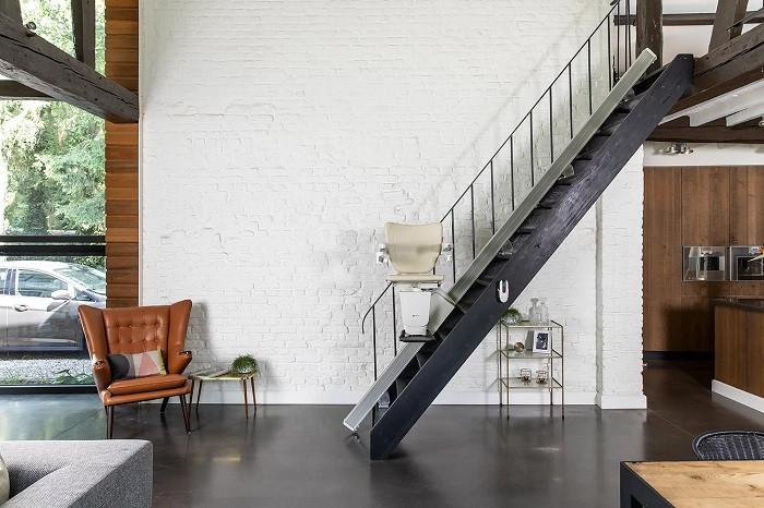 Ce monte escalier à fonctionnement électrique permet aux personnes à mobilité réduite de monter et de descendre facilement les escaliers.