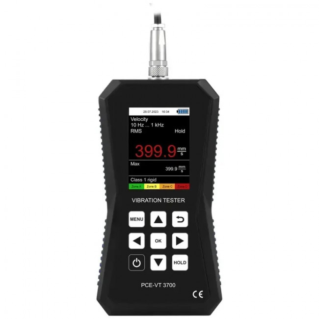 - Vitesse de 0,00 à 399,9 mm/s, résolution 0,1 mm/s, précision ±2 %, sur une plage de fréquences de 10 Hz à 1 kHz