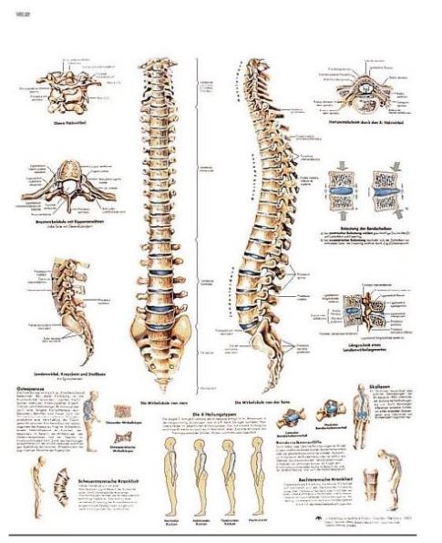 Planche anatomique de la Colonne vertébrale. D’un format compact, couleur brillante, construction robuste et contenu scientifique exact font de ces planches une aide indispensable à l’éducation du patient et à la démonstration.