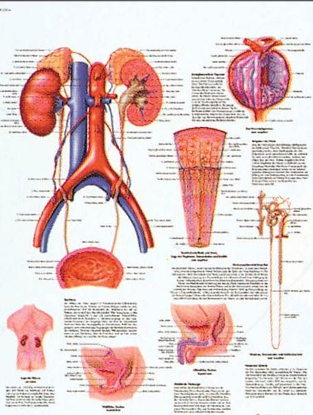 Planche anatomique de l'appareil urinaire. D’un format compact, couleur brillante, construction robuste et contenu scientifique exact font de ces planches une aide indispensable à l’éducation du patient et à la démonstration.