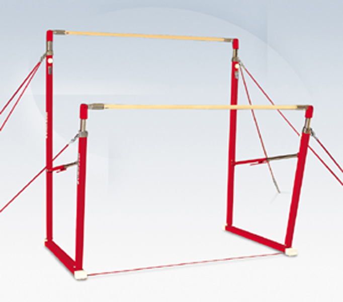 Il s'agit de barres asymétriques de compétitionconformes aux nouvelles normes FIG, le réglage de la hauteur des porte-mains (montants gradués en cm) se fait par tubes coulissants, cliquets et molettes de serrage. Montage et démontage de l'haubanage immédiats grâce aux tendeurs rapides.