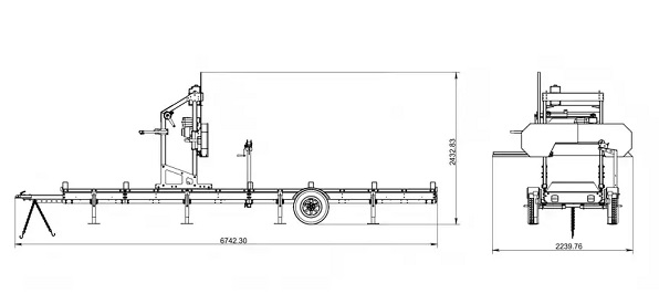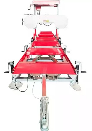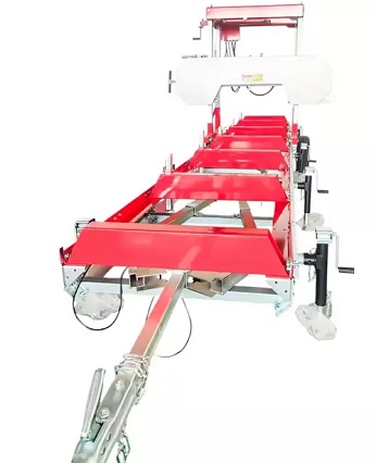 Le banc de sciage sur remorque est équipé d’un timon à boule de 50 mm, d’un éclairage arrière et de rampes de chargement, assurant un transport simple et rapide.