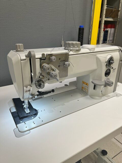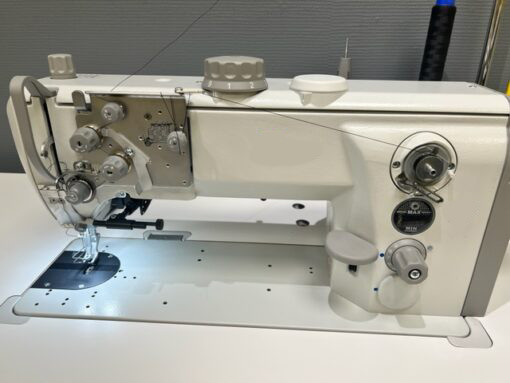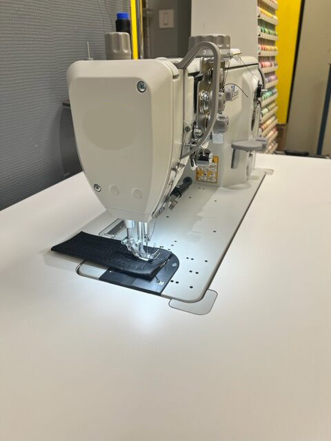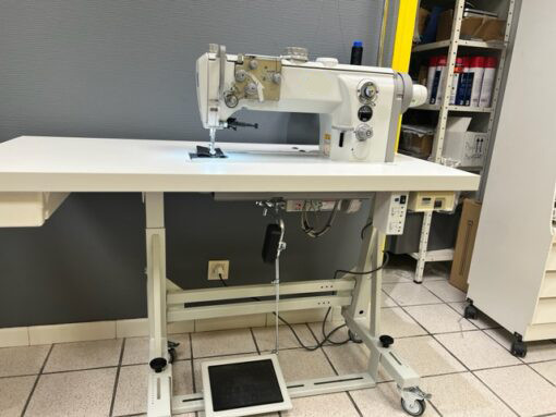 Machine à coudre triple entrainement avec base plane assurant une couture précise et rapide.