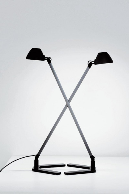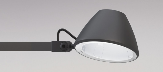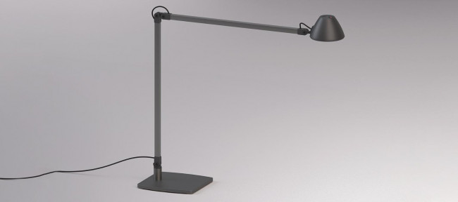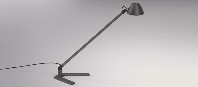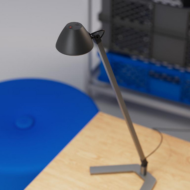 Cette lampe de table de bureau LED a un cadre en aluminium et une base en forme de V qui lui donne un support stable. La petite tête de lampe est conçue comme un hémisphère et diffuse la lumière directement vers le bas.
