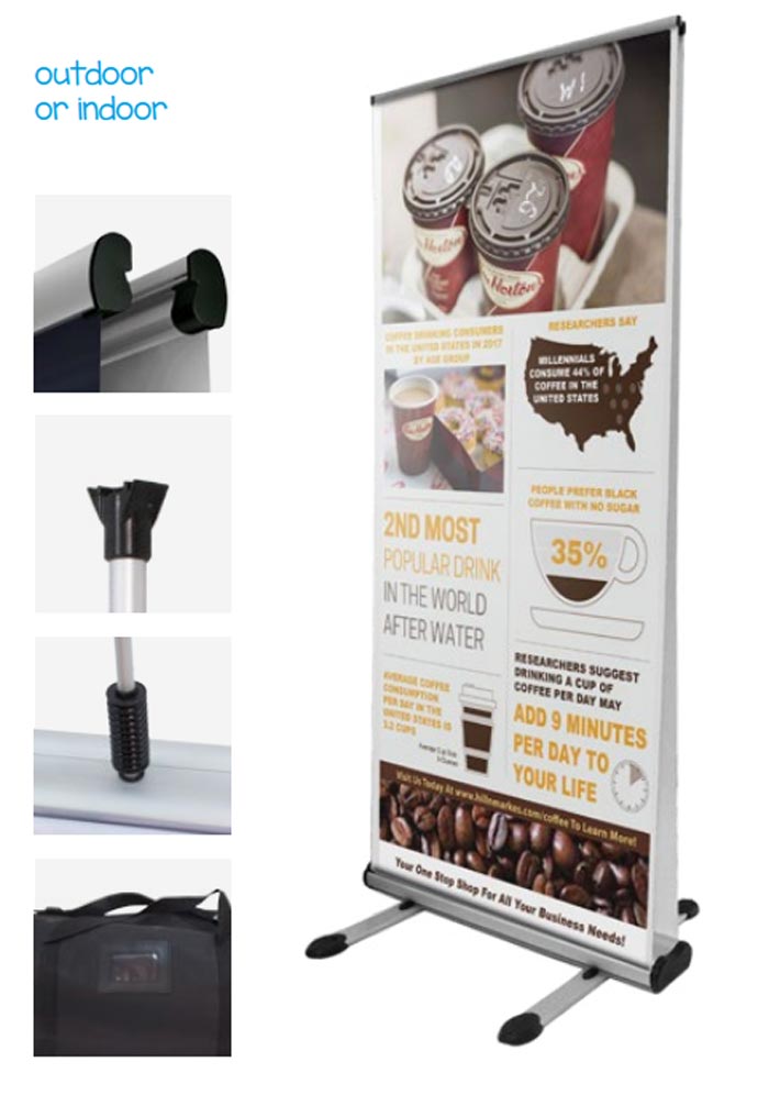 Ce totem pour bâches de PLV est convenable pour une utilisation à l’intérieur ou à l’extérieur de vos locaux.
