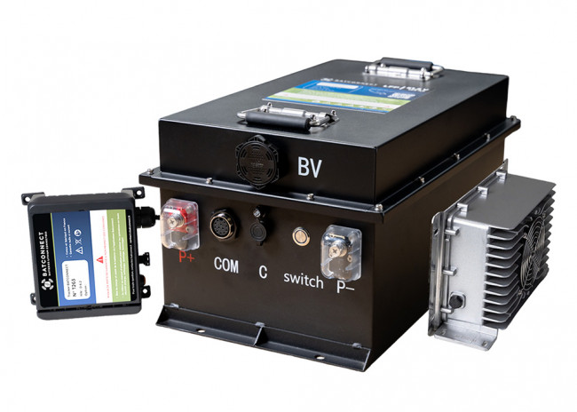 Solution complète : batterie lithium avec chargeur embarqué, boîtier intelligent, pistolet de recharge et système de monitorage.
