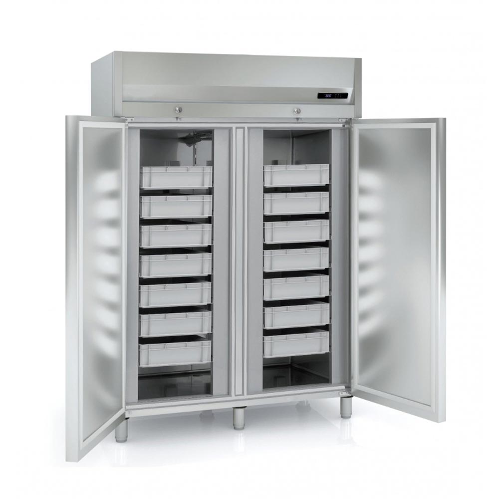 - Modèle 409 L , 645 L , 1404 L : Livré avec 7 bacs plastique avec fond inox perforé 400*600*120 mm par porte
