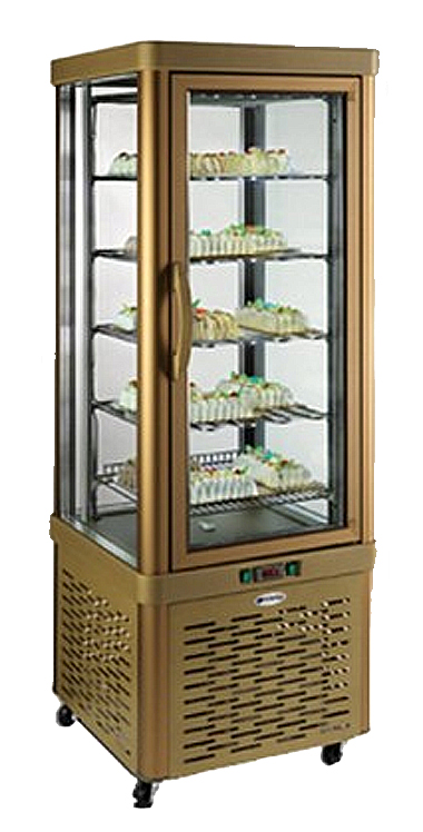 Vitrine réfrigérée panoramique à 4 faces vitrées et 5 étagères.