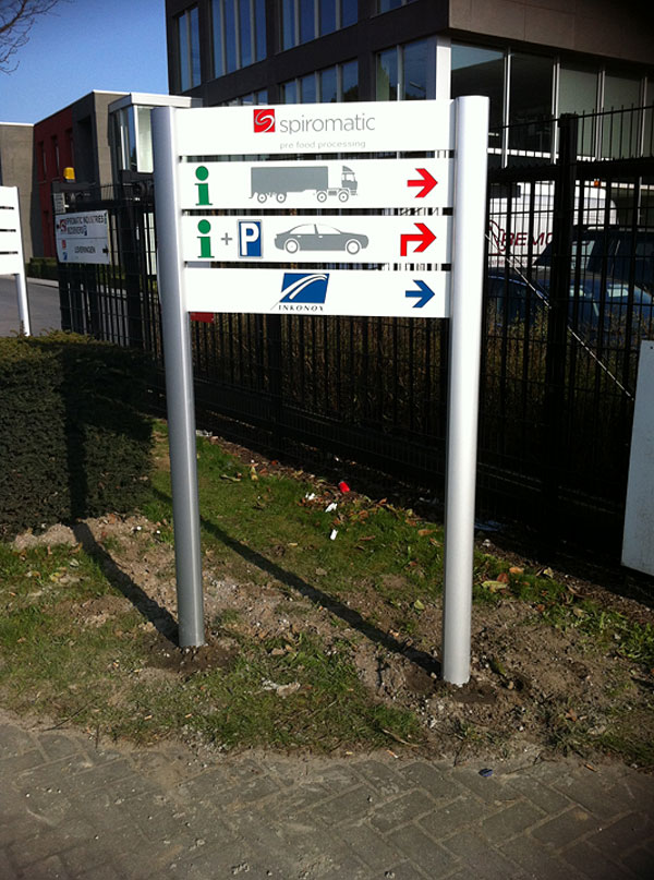 avec les logos signalétiques, et au dessus un panneau avec le logo de la société.