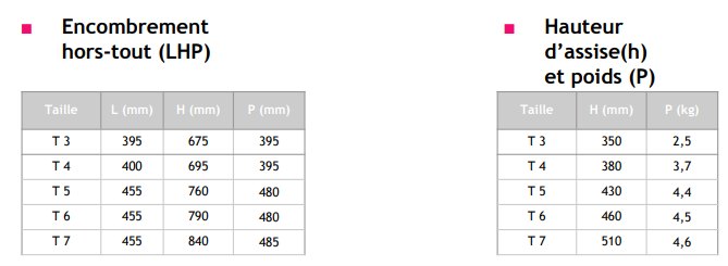 (Taille T3) : L: 395 mm / H: 395 mm / P: 675 mm (Taille T4) : L: 400 mm / H: 395 mm / P: 695 mm (Taille T5) : L: 455 mm / H: 480 mm / P: 790 mm (Taille T6) : L: 455 mm / H: 480 mm / P: 790 mm (Taille T7) : L: 455 mm / H: 840 mm / P: 485 mm