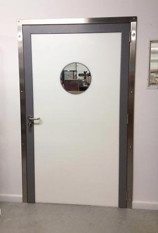 renfort arrière par U inox, joint anti pince doigts souple aux bords arrondis, hublots diamètre 350 mm en PMMA épaisseur 15 mm bi affleurant, charnières va et vient en DERLIN avec mécanisme tout inox avec ou sans système de blocage à 90° huisserie en inox 304L en U ou en C, Protection basse en inox ou PEHD, par plaque ou aile d"avion