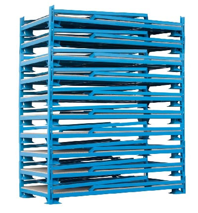 Cette palette matières lourdes est équipée de parois latérales rabattables et les extrémités de poteau sont inclinées vers l'intérieur.
