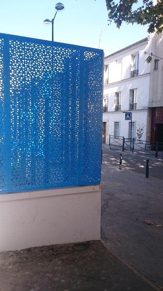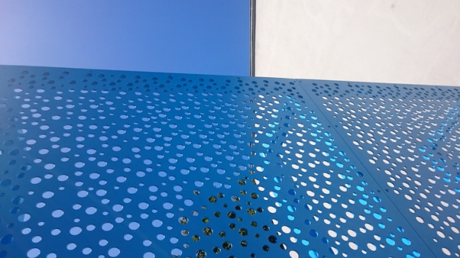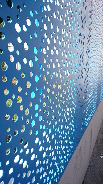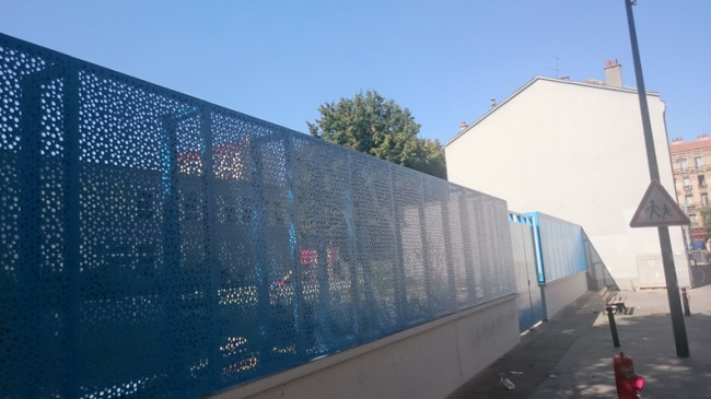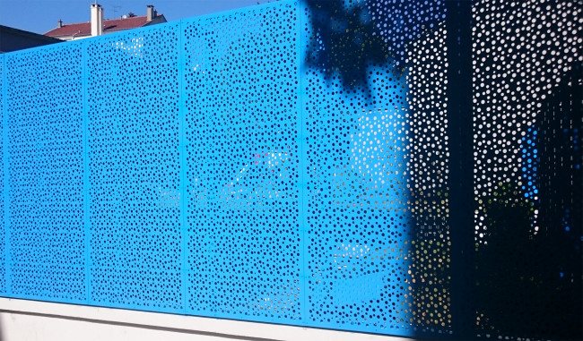 La clôture est la première surface au contact du public lors de l’arrivée à l’école maternelle. Elle permet d’une part de donner une ambiance lumineuse et colorée au site, sur ce jeu de teinte bleuté qui s’associe à la couleur du ciel pour donner légèreté et gaité au mouvement des bulles de savon dispersés dans la tôle perforée.