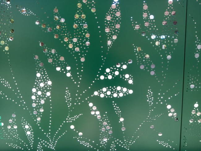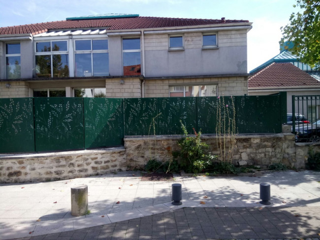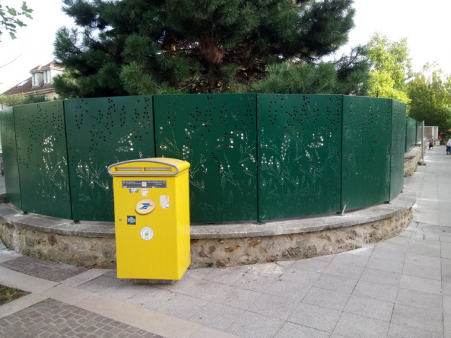 Les panneaux perforés au motif végétal vert donne une dynamique continue sur le linéaire de clôture qui serpente le trottoir de la ville.
