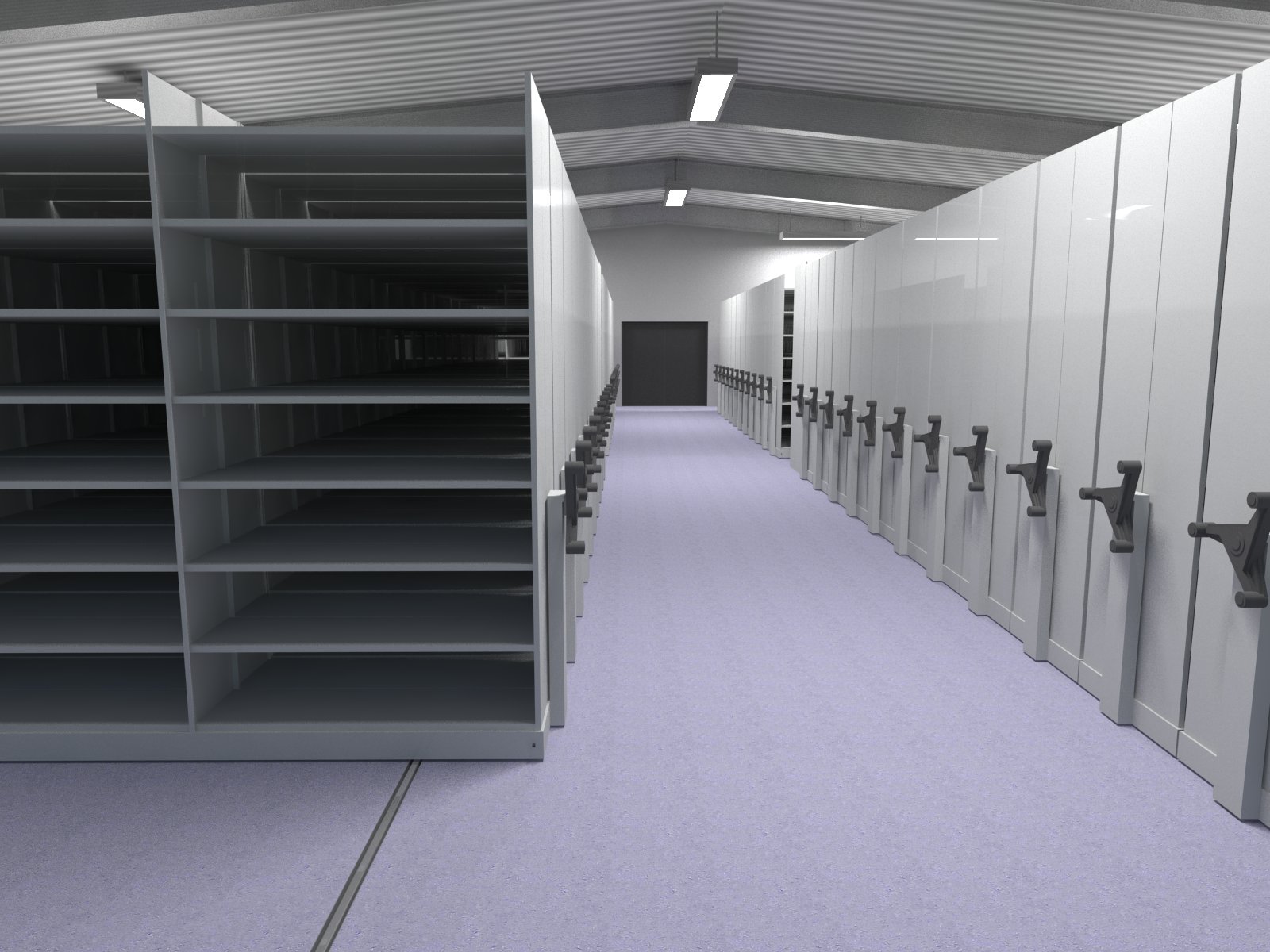 - 1 rayonnage à déplacement manuel, sur rail, 28ml de rangement sur étagères.