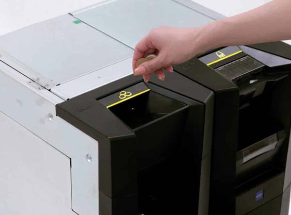 - Permet l’insertion des billets en liasse et des pièces en poignée