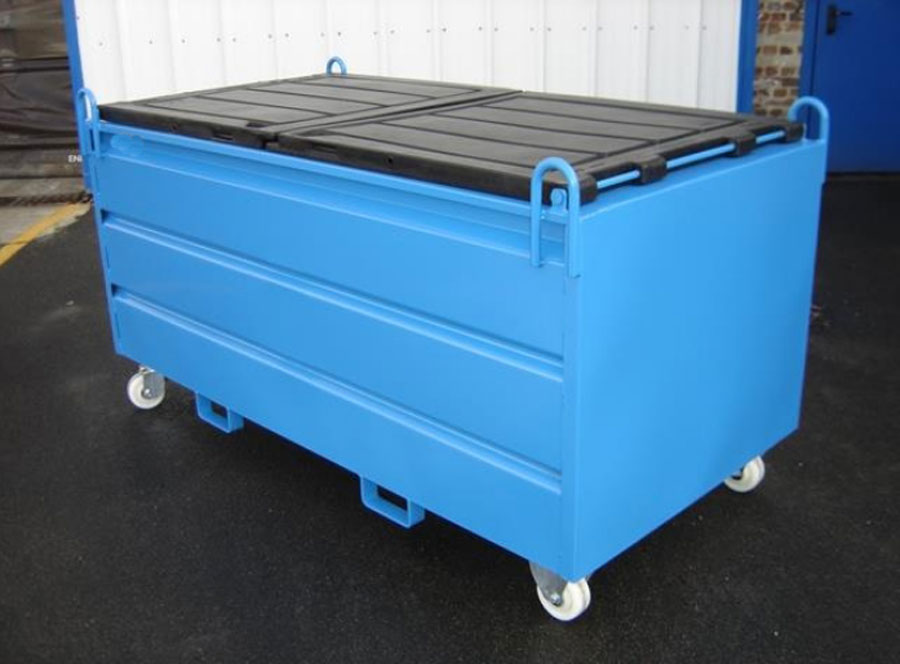 savez faire des caisses palettes métallique sur roue et passage fourche de 660 et plus, équipé d"un couvercle suffisamment costaud pour être exploité par un lève bac de compacteur?