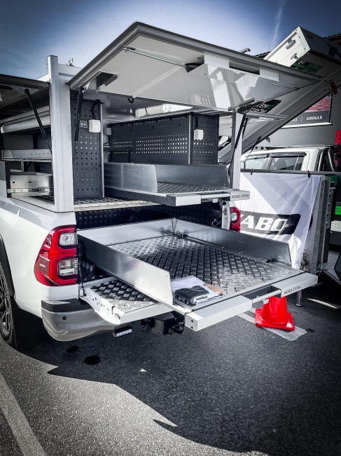 Nous souhaitons un aménagement pour Toyota hilux, nous sommes somme exploitant forestier il faut prévoir un espace pour la cuve à gazole de 400L et créer des rangements pour 4 tronçonneuses, bidons essence, sac à dos et boîte à outils.