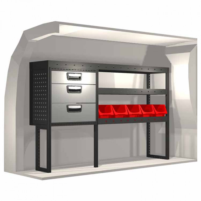 Ce kit d’aménagement a été spécialement conçu pour assurer une adaptation optimale ainsi que la meilleure fonctionnalité et sécurité possible. Il a été développé pour un usage professionnel, est flexible et est destiné à des métiers de services dans des domaines variés. Toutes les étagères sont équipées de tapis caoutchouc.