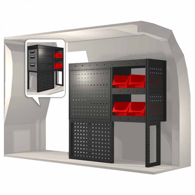 Ce kit d’aménagement a été spécialement conçu pour assurer une adaptation optimale ainsi que la meilleure fonctionnalité et sécurité possible. Il a été développé pour un usage professionnel, est flexible et est destiné à des métiers de services dans des domaines variés. Toutes les étagères sont équipées de tapis caoutchouc.