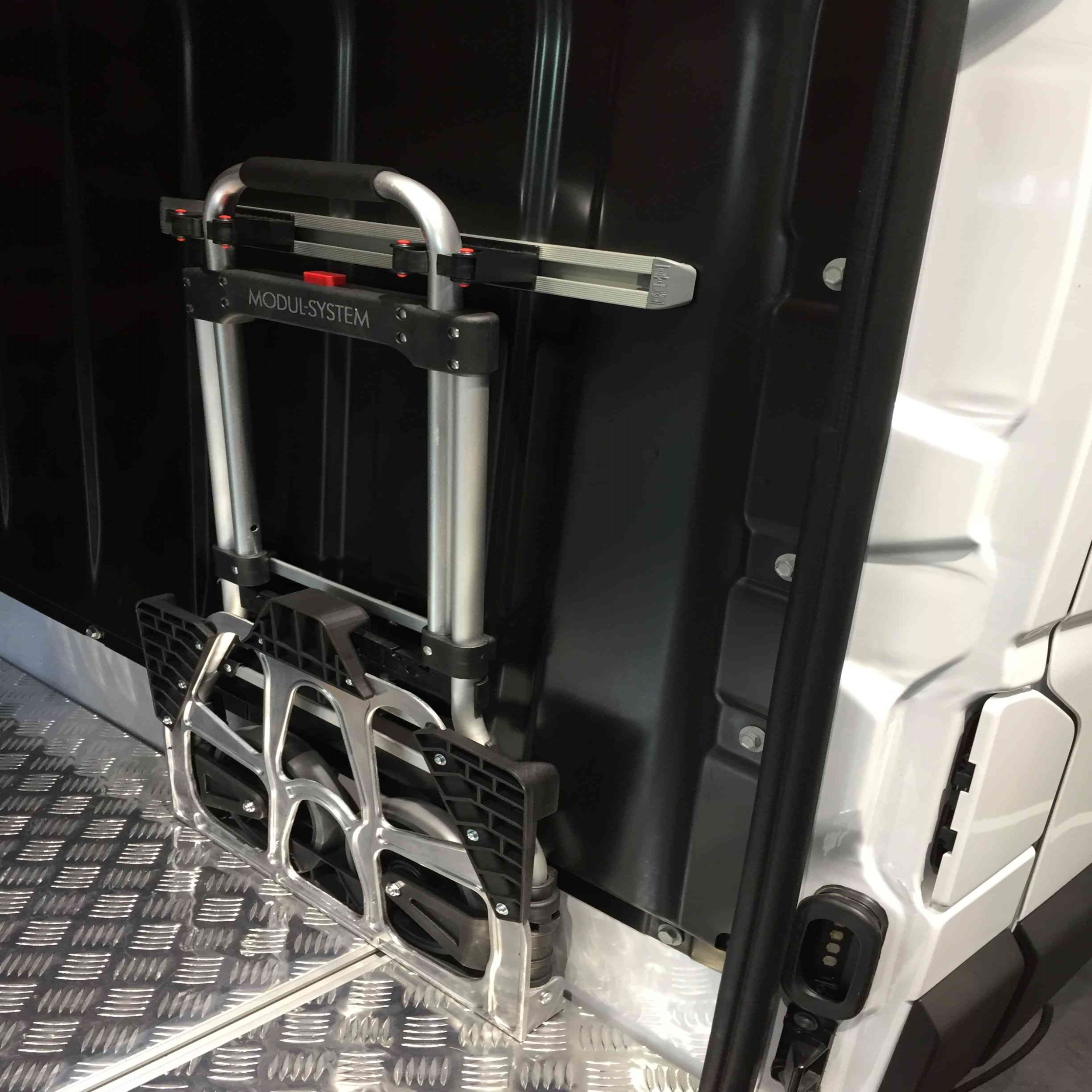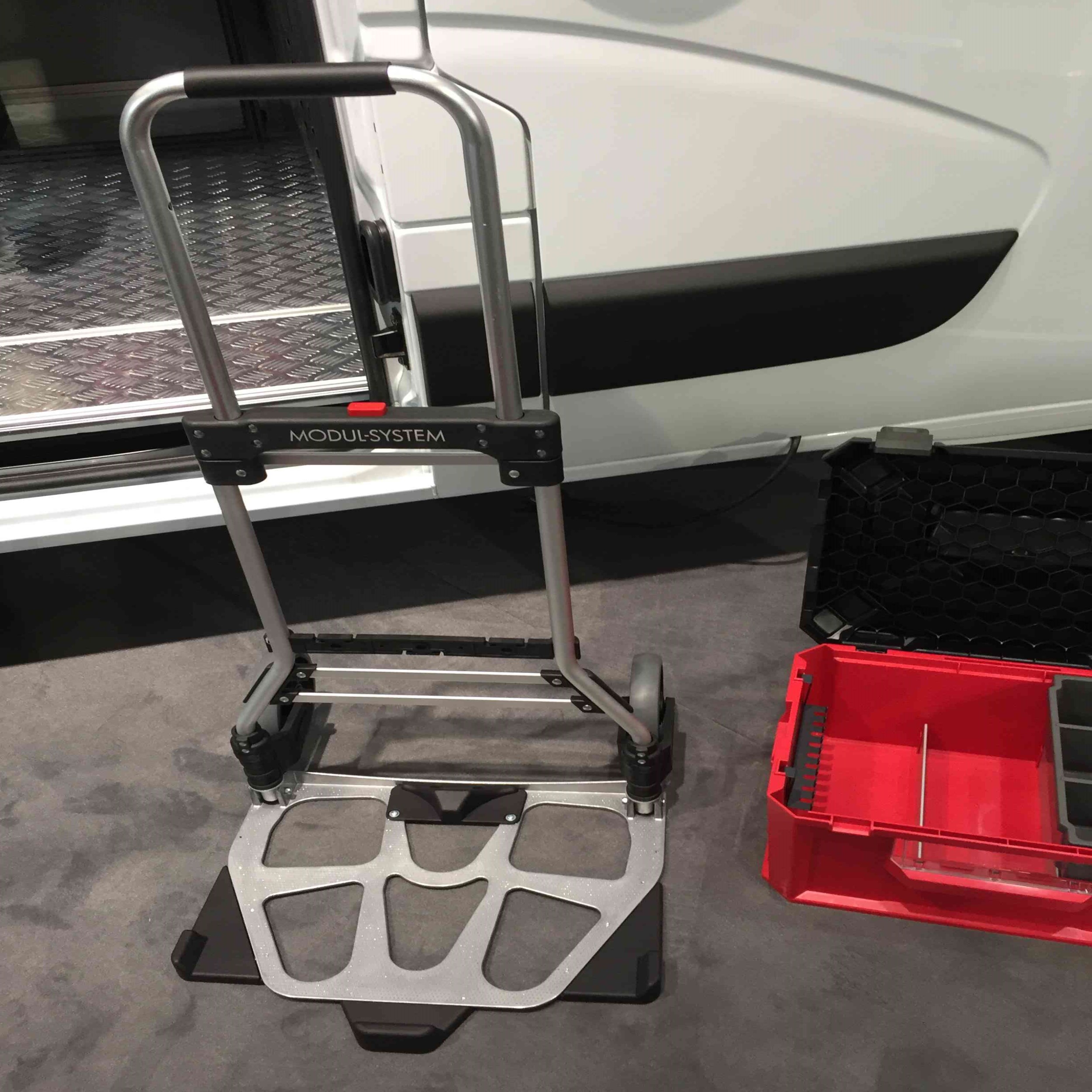 Le chariot est robuste, léger et pliable, occupant ainsi un espace réduit dans le véhicule. Nous proposons aussi une solution intelligente pour fixer le chariot dans le véhicule.
