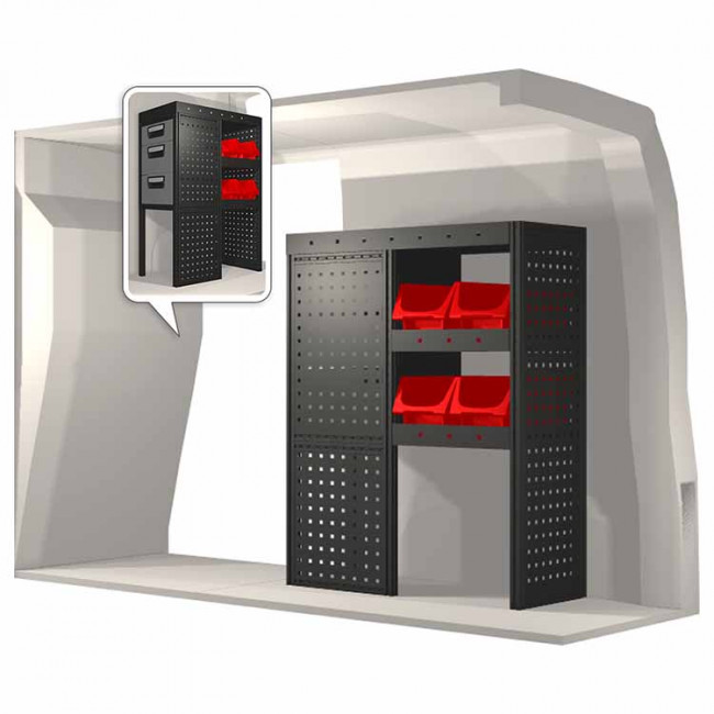 Ce kit d’aménagement a été spécialement conçu pour assurer une adaptation optimale ainsi que la meilleure fonctionnalité et sécurité possible sur votre véhicule. Il a été développé pour un usage professionnel, est flexible et est destiné à des métiers de services dans des domaines variés. Toutes les étagères sont équipées de tapis caoutchouc. Chaque tiroir est équipé en version standard de glissières sur roulements à billes et sa charge maximale est de 30 kg, tandis que la charge totale par bloc est de 100 kg. Les tiroirs peuvent être ouverts à fond et sont équipés d'arrêtoirs. Les dimensions des tiroirs sont 1 tiroir en 324x324x108 mm et de 2 tiroirs en 324x324x162 mm. Les composants d’assemblage et de fixation sont inclus ainsi que les 4 Modul-Box 162x324 mm. Dimensions du KIT : 675x324x918 mm Le poids total de cet aménagement est de 26,10 kilos. Temps de montage : 3 heures.