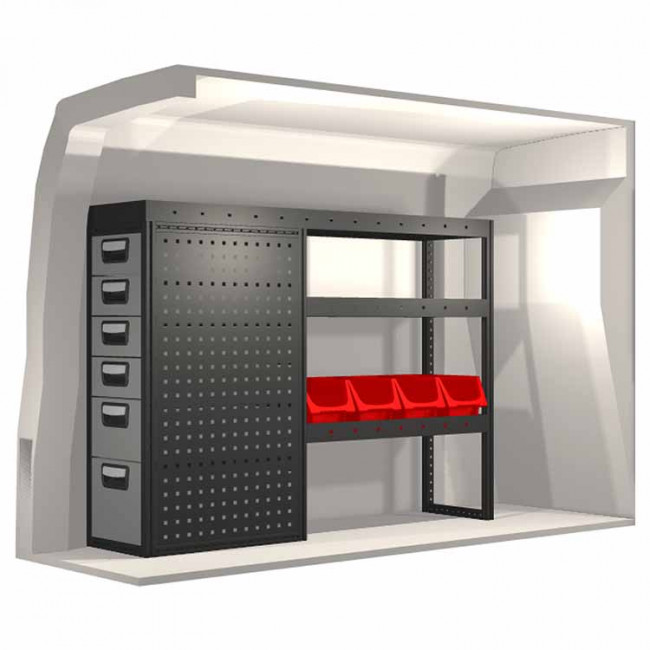 Ce kit d’aménagement a été spécialement conçu pour assurer une adaptation optimale ainsi que la meilleure fonctionnalité et sécurité possible. Il a été développé pour un usage professionnel, est flexible et est destiné à des métiers de services dans des domaines variés. Toutes les étagères sont équipées de tapis caoutchouc. Chaque tiroir est équipé en version standard de glissières sur roulements à billes et sa charge maximale est de 30 kg, tandis que la charge totale par bloc est de 100 kg. Les tiroirs peuvent être ouverts à fond et sont équipés d'arrêtoirs. Référence produit : 20100072 Dimensions : 1161 x 324 x 918 mm Dimensions des tiroirs :