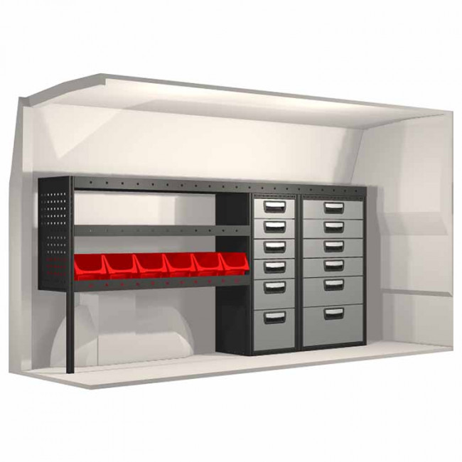 Ce kit d’aménagement a été spécialement conçu pour assurer une adaptation optimale ainsi que la meilleure fonctionnalité et sécurité possible. Il a été développé pour un usage professionnel, est flexible et est destiné à des métiers de services dans des domaines variés. Toutes les étagères à rebords sont équipées de tapis caoutchouc et ont une capacité de charge de 120 kilos.
