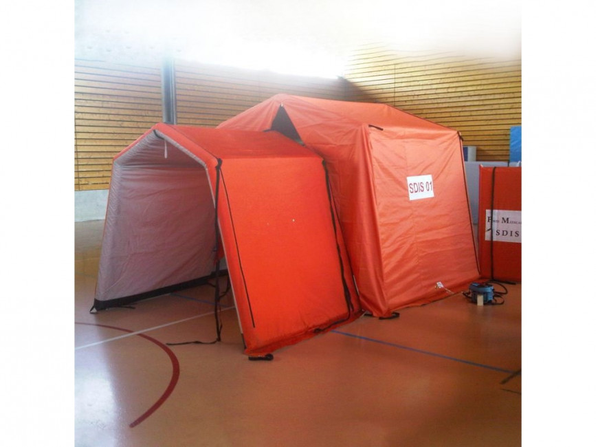 Cette tente d'intervention gonflable est utilisée par le personnel médical en cas d'opération sensible ou catastrophe sanitaire.