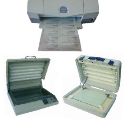 - Unité d’exposition ultraviolet format utile 550 x 350 mm, 6 tubes UV de 20 W, système à vide par gonflage d’une valve, minuterie digitale pour allumage/extinction des tubes + sonnerie.