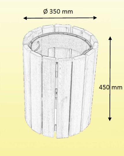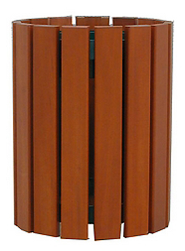 Dotée d’un habillage latte bois (section 20 x 60 en résineux et en exotique) et une armature et panier receveur de sac en acier laqué vert.