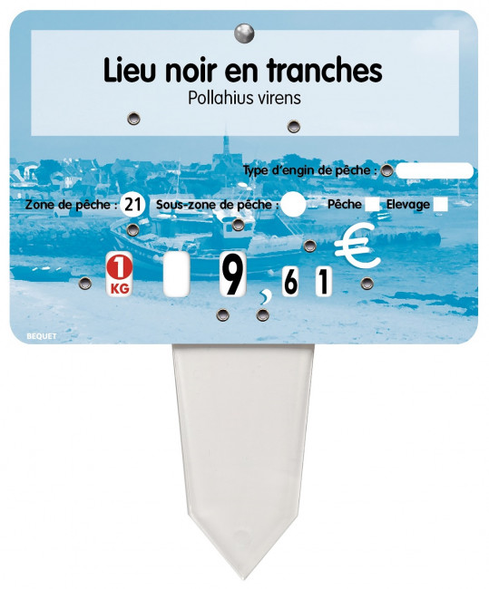 Deux options d’étiquetage sont proposées : une étiquette neutre sans texte ou une étiquette prix poissonnerie personnalisable selon les besoins du point de vente.