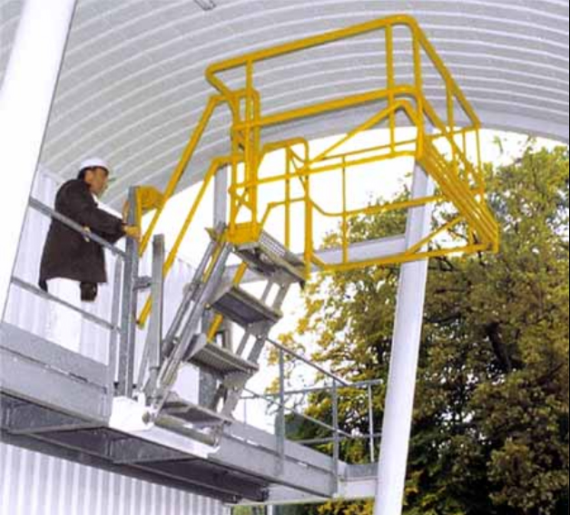 Escaliers articulés d'accès sur les dômes des citernes mobiles (routières et ferroviaires)à partir du seuil d'une aire de circulation (passerelle, plate-fo
