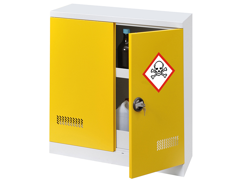Armoire de sécurité simple paroi avec rétention, structure robuste en acier 9/10e, sans montant central pour faciliter les manipulations, et peinture haute résistance chimique.
