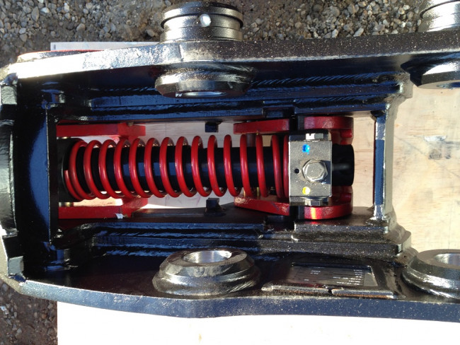 Il s'agit d'un type d'attaches rapides pour pelle d'une structure simple avec peu de pièces internes, étant équipée seulement d'un vérin, un ressort, 2 crosses, 2 clavettes et un fût de protection.