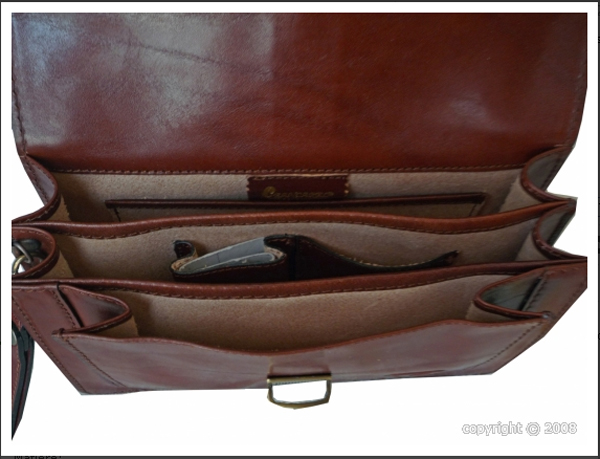Sacoche en cuir de couleur marron, fermée par un rabat doté d'une serrure à fermeture à clé et disposant d'une poche à l'arrière fermant par zip et d'une poignée pour le transport.