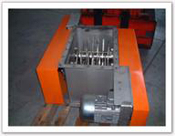- Equipés de couteaux (en quinconce) qui entraînent la matière arrivant gravitairement sur l'appareil entre ces deux parties tournantes. - Effet : brise toutes les mottes de manière à obtenir en sortie basse de l'appareil un produit dont la granulométrie maximum est maîtrisée. - Chaque arbre est entraîné par un moto réducteur par l'intermédiaire de poulies et courroies.