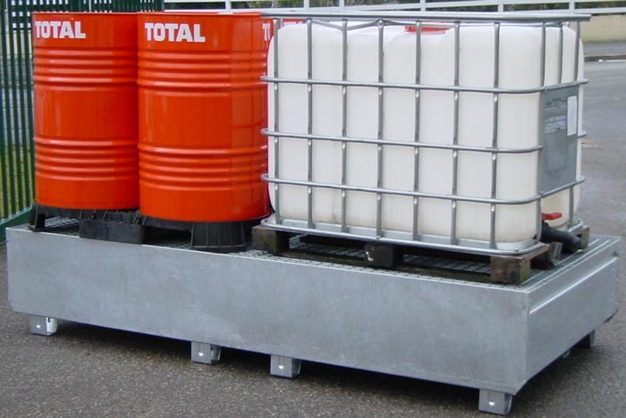 Ce bac de rétention en acier convient pour le stockage de produits inflammables et polluants.