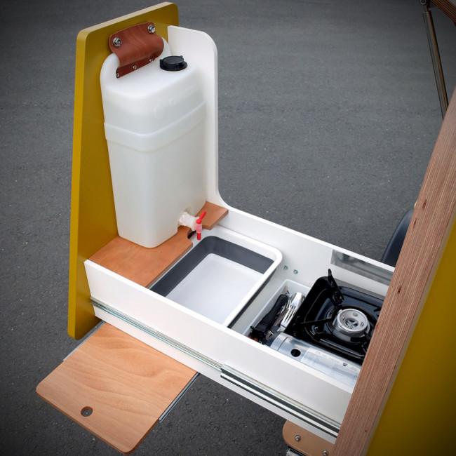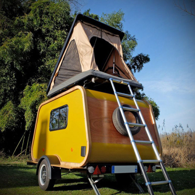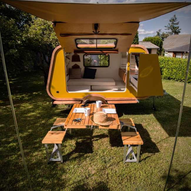 Cette mini-caravane propose un maximum de possibilités dans un minimum d’espace. Ingénieuse et confortable, elle vous accompagne lors de vos week-end et périples. Avec un design responsable, une fabrication locale et des valeurs.
