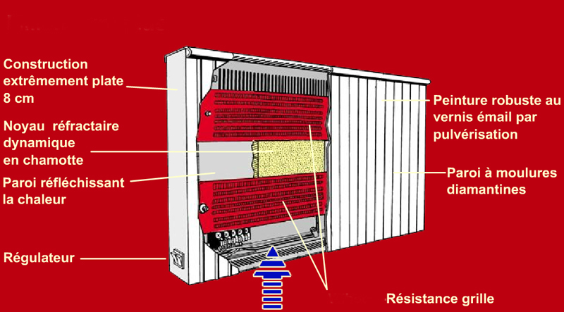 Pour ce type d'appareil, l'échange rapide de la chaleur est obtenu grâce aux nombreuses ailettes creuses verticales qui se trouvent sur sa paroi frontale.